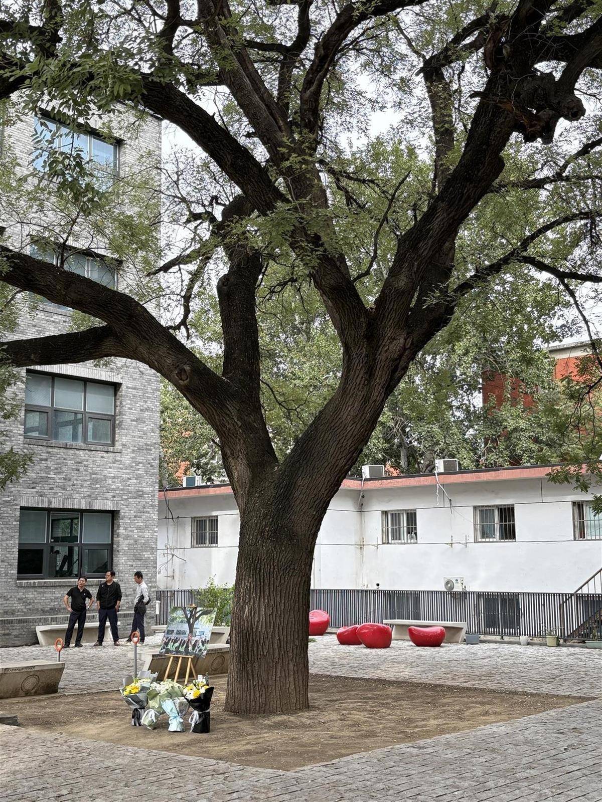 记者在现场看到,缅怀台设有两处,一处在景观楼一楼,大厅内悬挂着遗照,正下方摆放着各界人士献上的菊花;另一处设置在学院空地的大槐树下,树下放着一张俞孔坚生前在此处授课的照片。